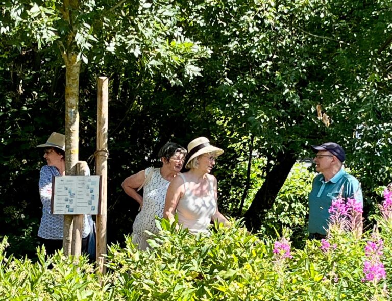 selbst gebackenen Kuchen und frische Crépes an. Da ließ es sich auch Frau Gronau, die Bürgermeisterin von Herborn, nicht nehmen bei einer Tasse Kaffee mit den Pflanzenfreunden zu plaudern. Sie konnte sich in aller Ruhe das Wildkräuterbeet anschauen. Hier fiel ein Blütenteppich aus blauem „Gundermann“ ins Auge und das „Lungenkraut“ war ein Magnet für zahlreiche Bienen und Hummeln. Alle Wild- und Heilpflanzen gedeihen an der Dill sehr gut und werden im Hochsommer bestimmt wieder viele Insekten mit ihrer Blütenpracht anlocken. Dies freut besonders die Spaziergänger und Radfahrer an der Dill.